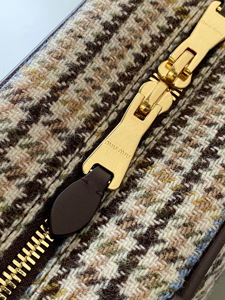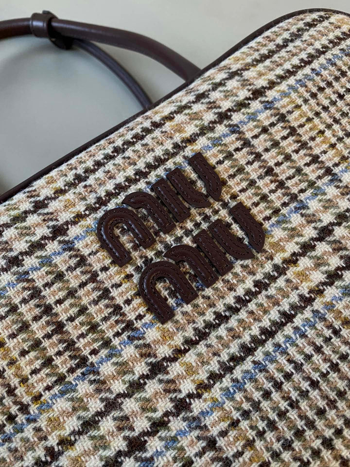 BEAU TOP HANDLE BAG 34 IN BEIGE TARTAN AND COCOA BROWN LEATHER TRIM