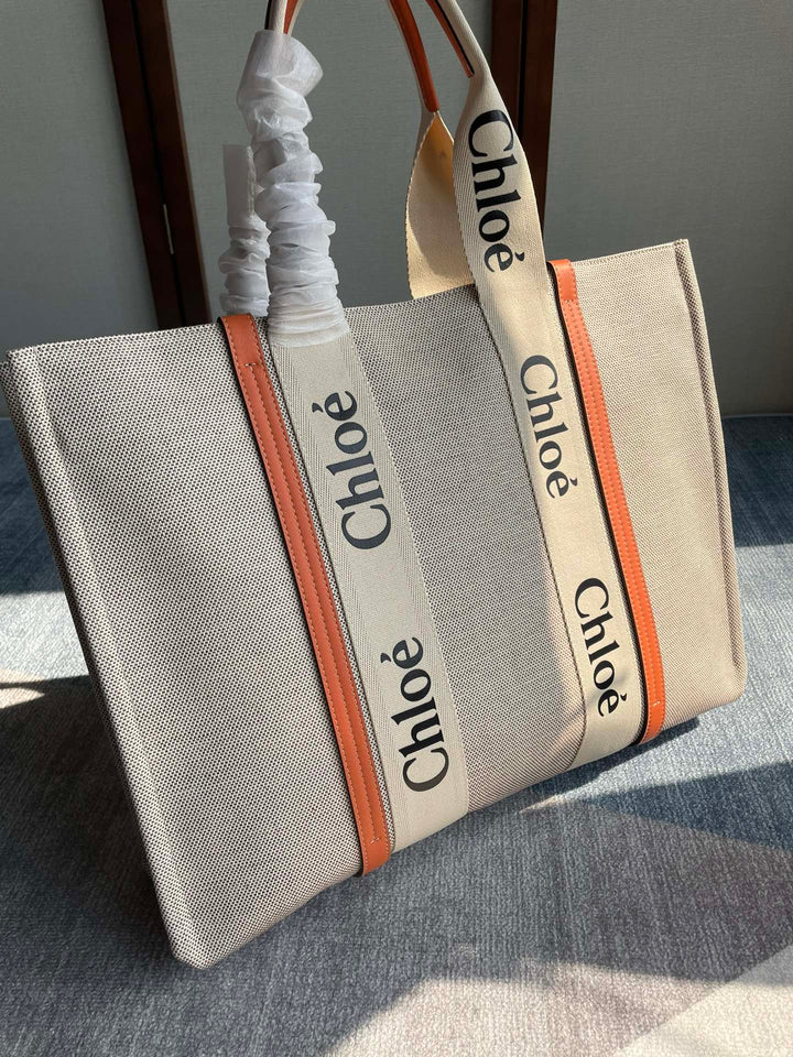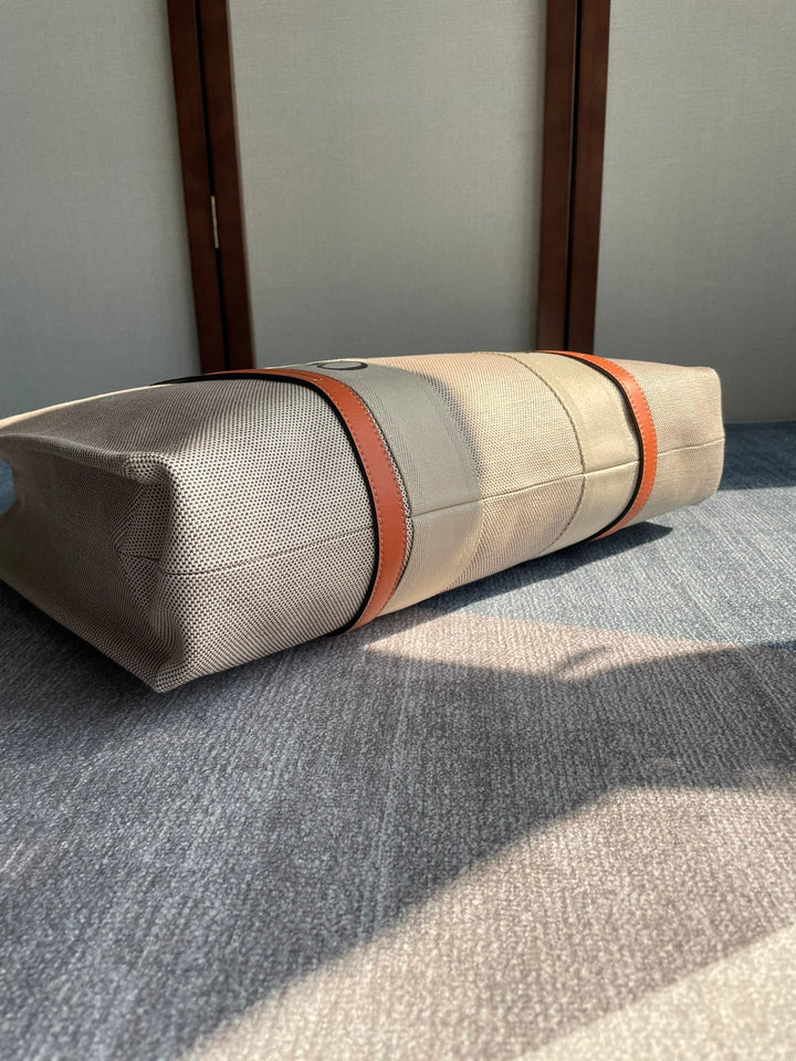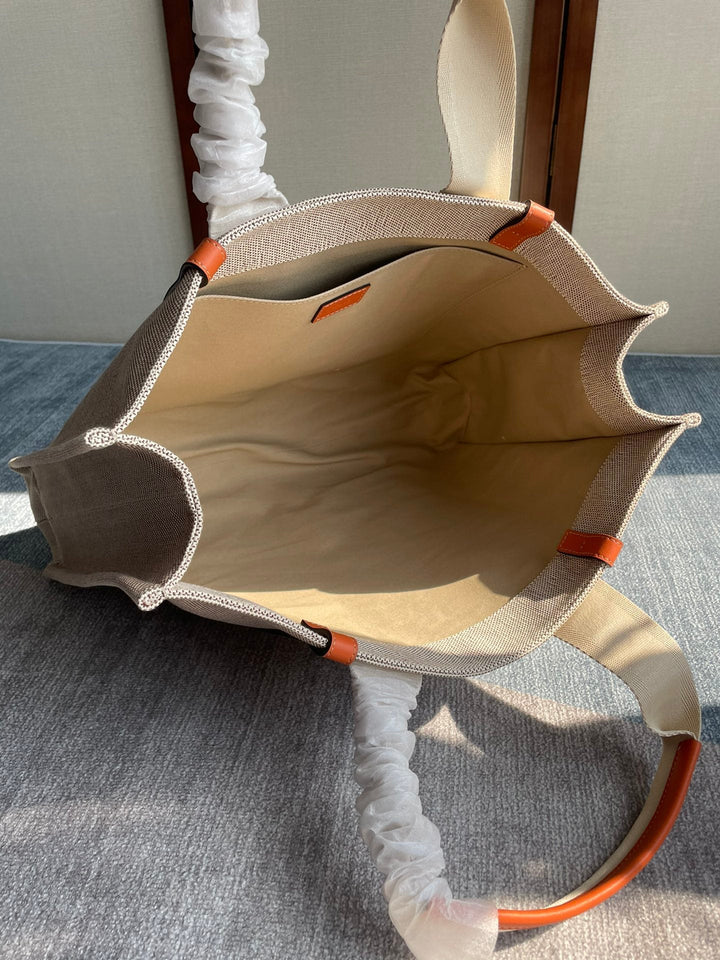 LAGRE WOODY TOTE BAG 45 IN BEIGE LINEN CANVAS BLACK WEBBING LOGO EMBROIDER ORANGE CALFSKIN