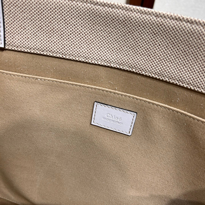 LAGRE WOODY TOTE BAG 45 IN BEIGE LINEN CANVAS BLACK WEBBING LOGO EMBROIDER WHITE CALFSKIN