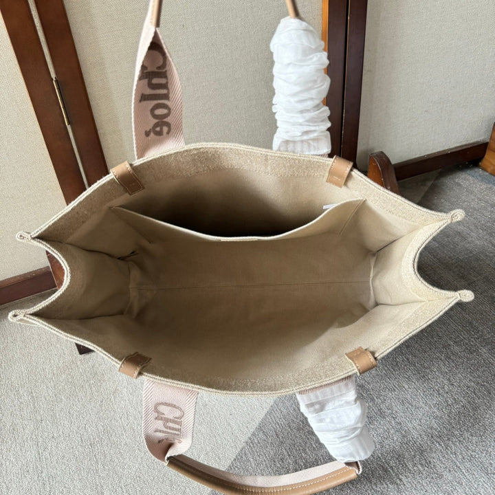 LAGRE WOODY TOTE BAG 45 IN BEIGE LINEN CANVAS LIGHT PINK WEBBING LOGO EMBROIDERY