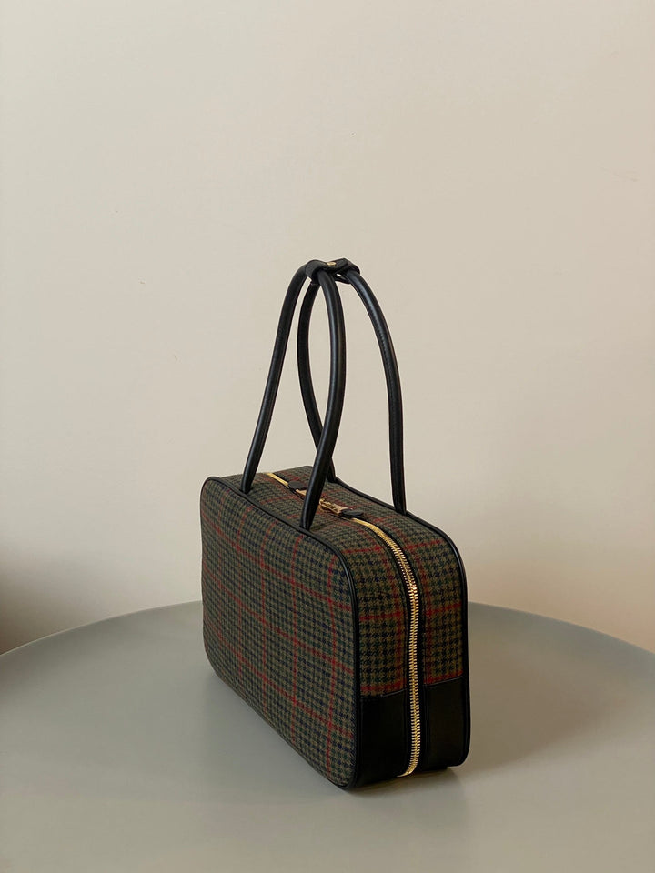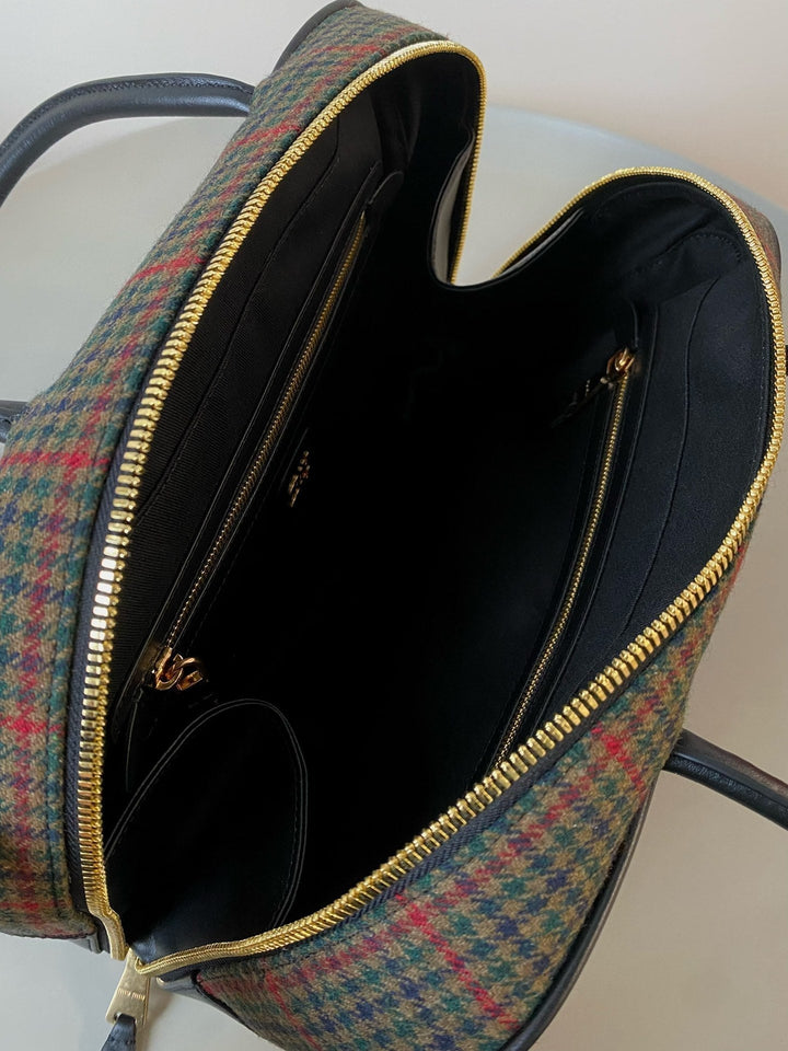 BEAU TOP HANDLE BAG 34 IN LODEN GREEN TARTAN AND BLACK LEATHER TRIM