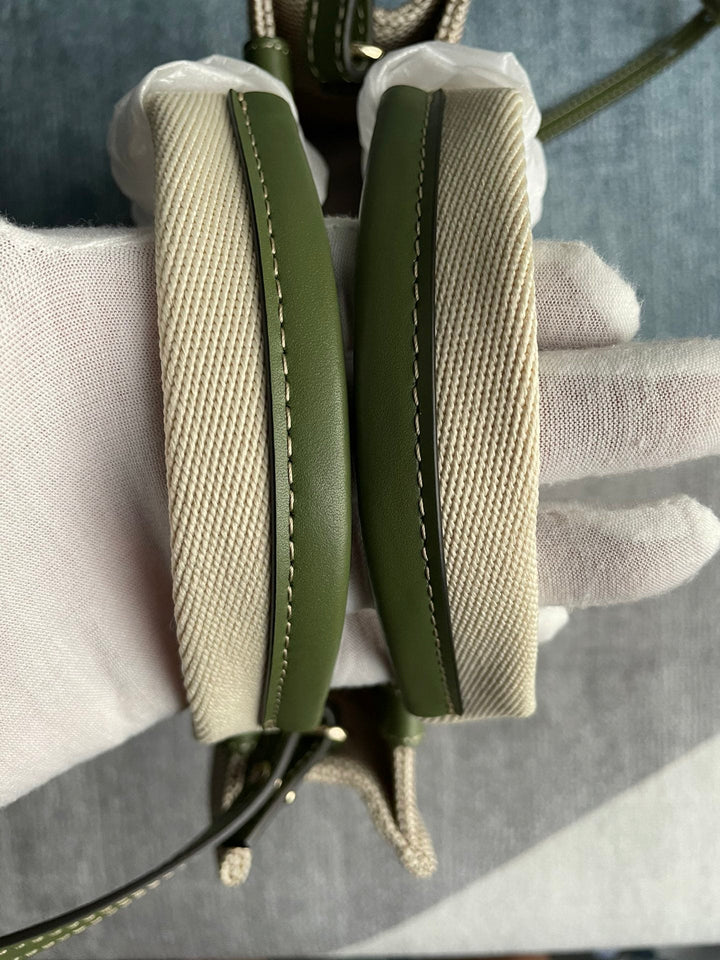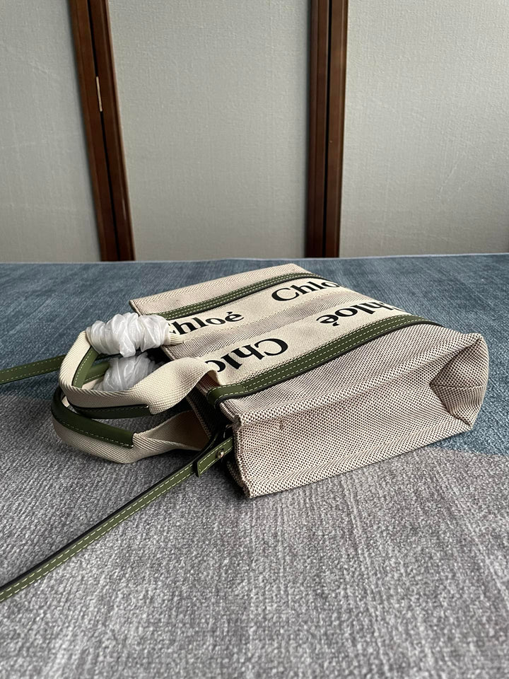 SMALL STRAP WOODY TOTE BAG 26.5 IN BEIGE LINEN CANVAS BLACK WEBBING LOGO EMBROIDER GREEN CALFSKIN