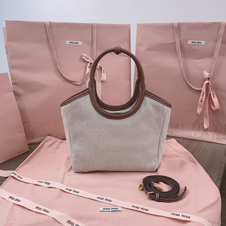 SMALL TOTE BAG 22 IN WHITE CANVAS AND BROWN CALFSKIN TRIM