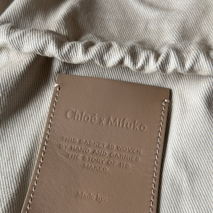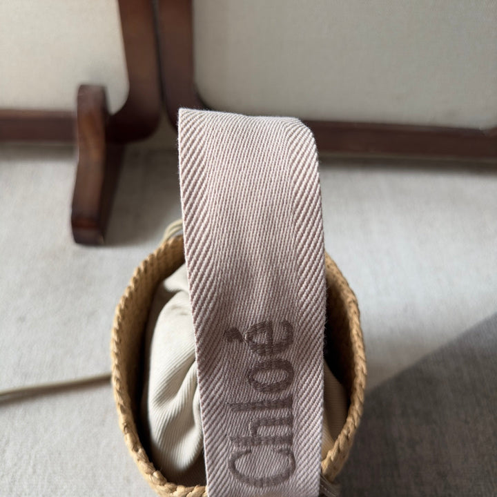 SMALL WOODY BASKET 17 IN NATURAL FIBERS BLUSHY BEIGE WEBBING BROWN CALFSKIN